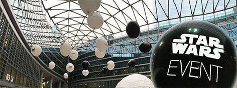 EVENTO ESSELUNGA STAR WARS REALIZZATO A MILANO PRESSO PALAZZO REGIONE LOMBARDIA. L'EVENTO E' STATO REALIZZATO CON PALLONI GIGANTI IN LATTICE DEL DIAMETRO DI 1,60 METRI GONFIATI CON GAS ELIO