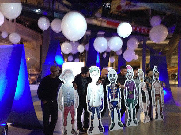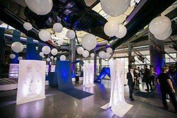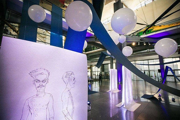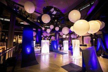 ALLESTIMENTO CON PALLONI GIGANTI PER LA PRESENTAZIONE DEL NUOVO DISCO DEI NEGRAMARO PRESSO IL MUSEO DELLA SCIENZA E DELLA TECNICA DI MILANO. UTILIZZO DI PALLONI IN LATTICE GIGANTI DI VARI DIAMETRI PER IL SOLLEVAMENTO DI MANIFESTI PUBBLICITARI.