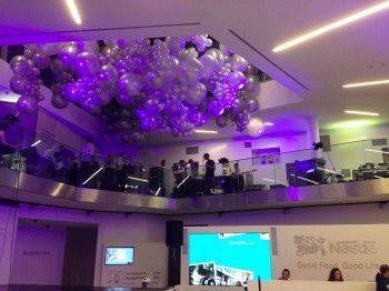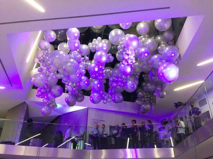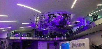 ALLESTIMENTO CON PALLONI METALLIZZATI ARGENTO DI VARIE DIMENSIONE DELLA HALL DEL NUOVO COMPLESSO NESTLE' DI ASSAGO (MI) PER LA FESTA NATALIZIA.