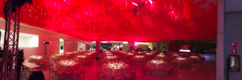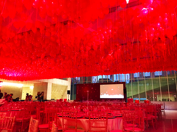 Cena Natalizia presso la Bocconi di Milano in data 12 Dicembre 2017. Gonfiaggio a gas elio di 7.000 palloncini rossi con nastrino oro.