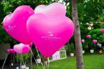 Allestimento con palloncini a cuore personalizzati presso Bulgari Hotel di Milano per Moet & Chandon. Allestimento del giardino esterno. Ambiente esclusivo come l'allestimento eseguito da Newballoonstore.