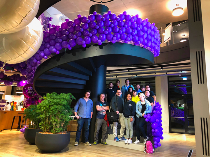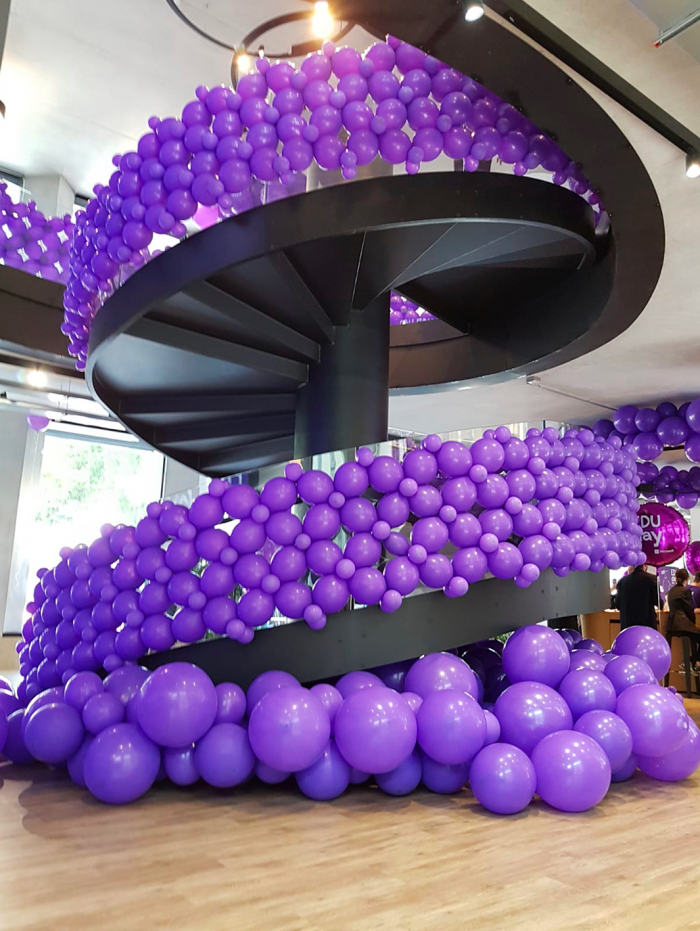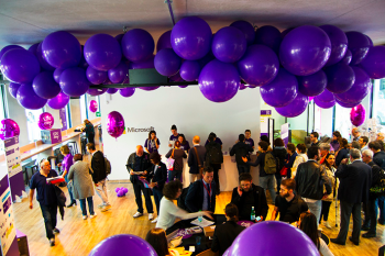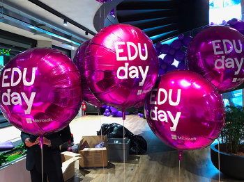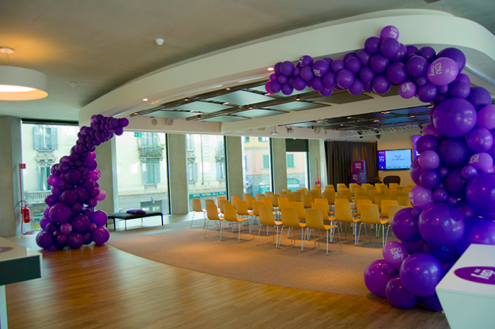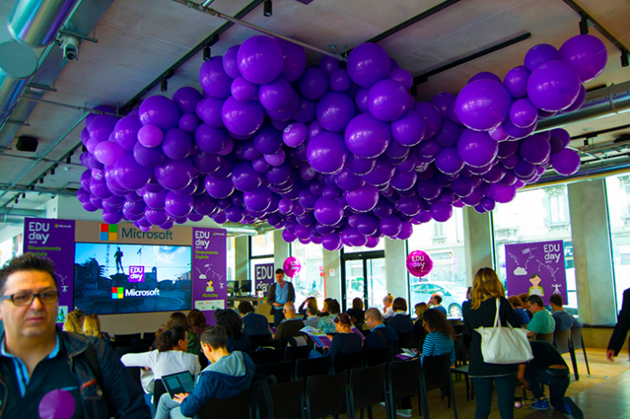 Allestimento con palloncini eseguito presso la sede Microsoft di Milano in occasione dell' Edu Day svoltosi il 17 Maggio 2018. Realizzazione di nuvole di palloncini e archi organici, palloni in mylar personalizzati da 36".