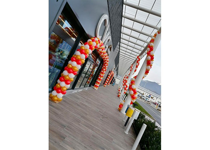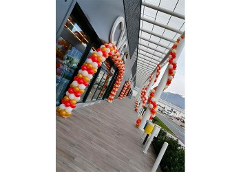 Allestimento per inaugurazione centro CVG Moda Ambivere (BG) composto da allestimento esterno con archi da 12 metri cad. e rivestimento colonne con pallonicni link 12 pollici e link 5 pollici.