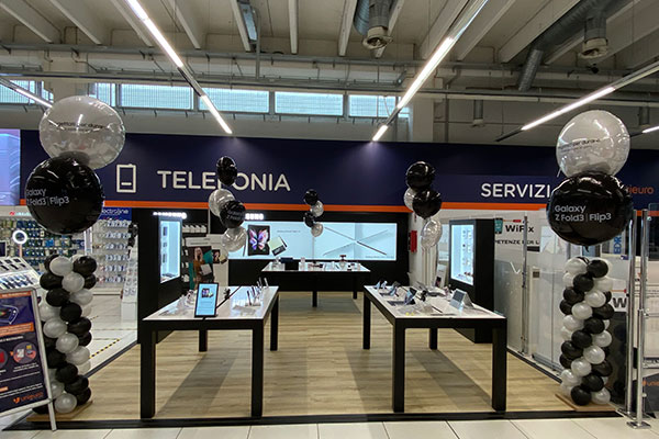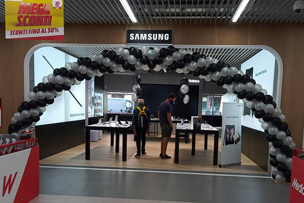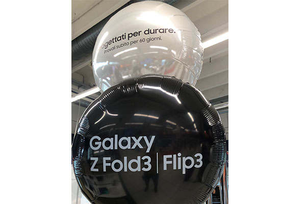 Newballoonstore incaricata da Samsung per la presentazione nei maggiori centri commerciali d'Italia dei nuovi telefoni Galaxy Z Fold3 e Flip3. Allestimento in 20 centri commerciali a partire da Roma Milano e tante altre città. Allestimento perfettamente organizzato ed installato in un solo giorno in tutti i centri composto da palloni in mylar personalizzati prodotti da Newballoonstore, totem di palloncini e archi.