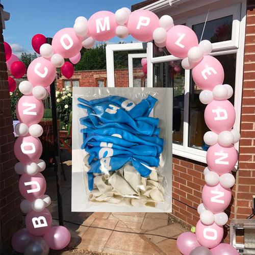 Kit Buon Compleanno componibile tramite palloncini link 12" e palloncini 5". Di facile realizzo e di grande effetto. Lunghezza totale 5,60 mt. In aggiunta è possibile acquistare le lettere singole link per comporre il nome del festeggiato. I palloncini si possono gonfiare con aria tramite pompa manuale o gonfiatore elettrico. Contenuto della confezione: