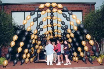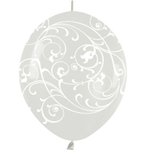 Palloncini Link 12" trasparenti con stampa filigrana in bianco. Busta da 50 Pz. Crea facilmente splendidi archi o ghirlande adatte per ogni occasione. Questi palloncini si annodano uno in coda all'altro e sono adatti sia al gonfiaggio con gas elio che con aria.