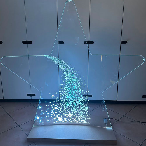 Novità assoluta Newballoonstore Led Panel Stella altezza 120 cm. Led Panel Stella viene fornita completa di: Base in MDF con guida luci LED RGB con telecomando dove puoi scegliere tra un infinita combinazione di colori o giochi luce, tutto ciò che verrà stampato o designato sul pannello prenderà magicamente luce e può essere cancellato per essere riutilizzato la prossima volta, alimentatore 220V, set di 5 pennarelli gesso liquido in 5 colori diversi. Assemblarlo è semplicissimo e lo usi infinite volte. Possibilità di stampa del tuo logo o grafica personalizzata.