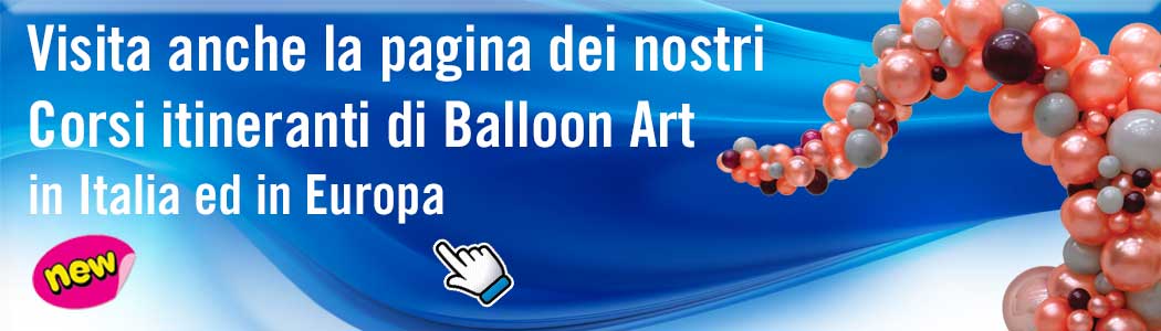 Corsi professionali di Balloon Art completi a partire dalle basi fino alle tecniche più avanzate dove tutto può essere fatto per passione o per un vero e proprio business. I corsi sono acquistabili singolarmente o a pacchetto completo dei 7 corsi avendo anche un notevole risparmio. Visita anche la pagina dei corsi itineranti che vengono svolti in tutta Italia ed Europa.
